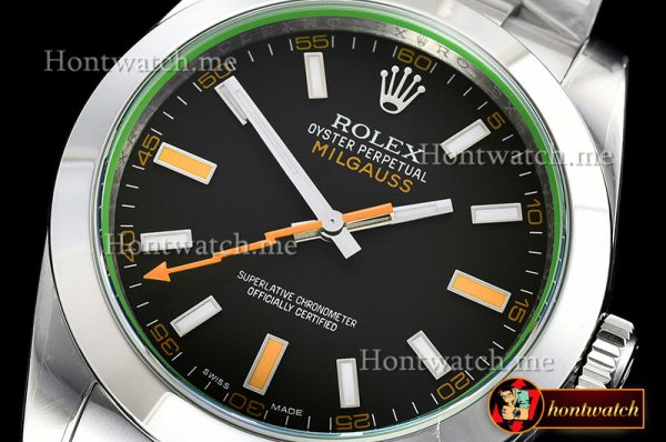 DIAL COLOR: Milgauss Black Dial (Swiss Grade Superlume Blue on Broad Markers and Superlume Green on the other markers) – Dial has exact markings like Genuine even on the base plate (Vintage style Orange Lightning Hand)